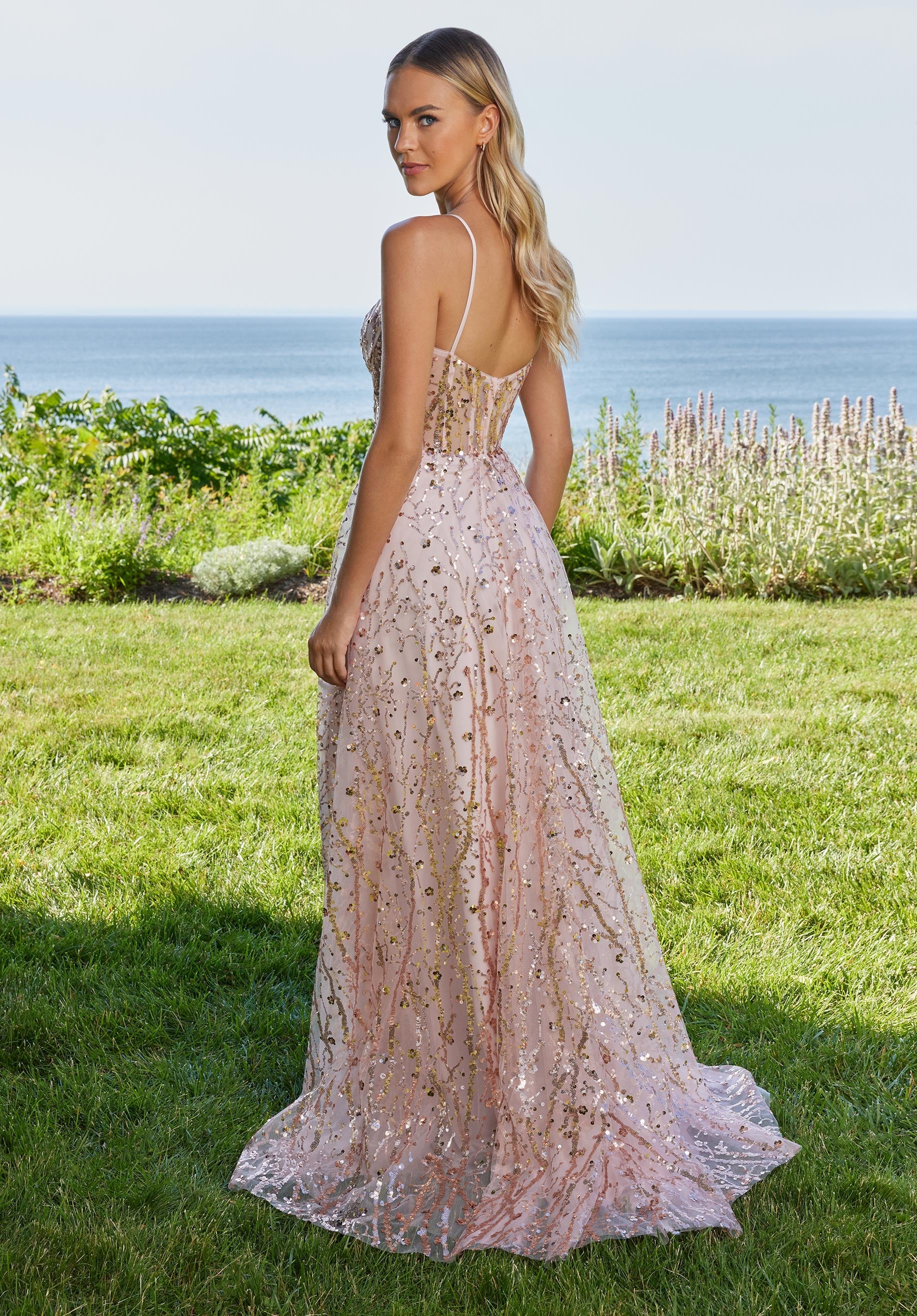 Romantic A-line dress has a dimensional sparkle in intricate sequin net fabric. The strapless bodice has a classic feel with sheer sides, an illusion back, and basque waist to enhance the silhouette. Pockets and a skirt slit are playful additions to the dress.