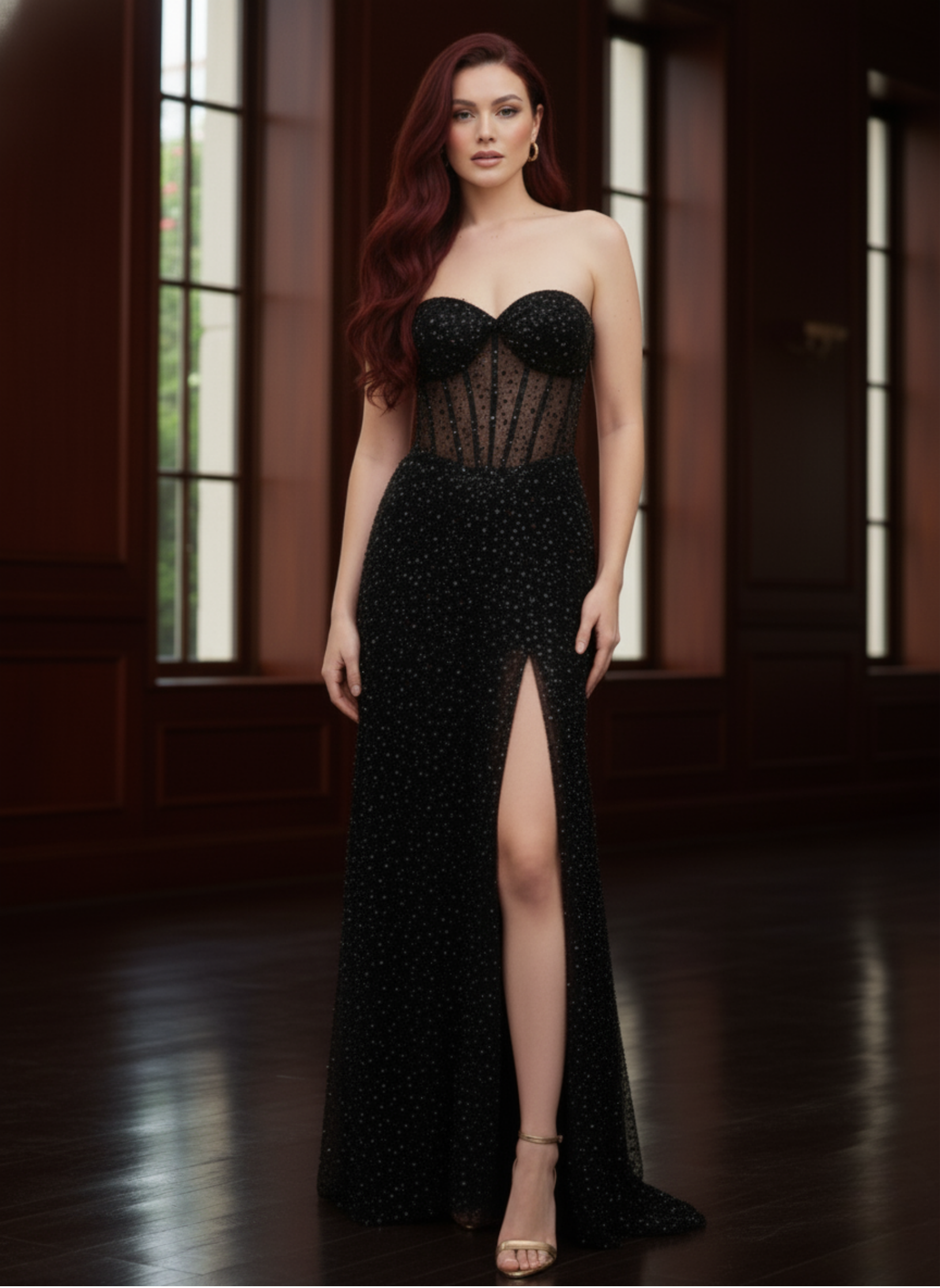 Glamorous sheath dress in sparkles from every angle in allover sequin net. The sheer bodice has a strapless sweetheart neckline with structured corset boning and a basque waist to draw the eye in. The skirt features subtle, grecian-inspired draping and a sultry slit.