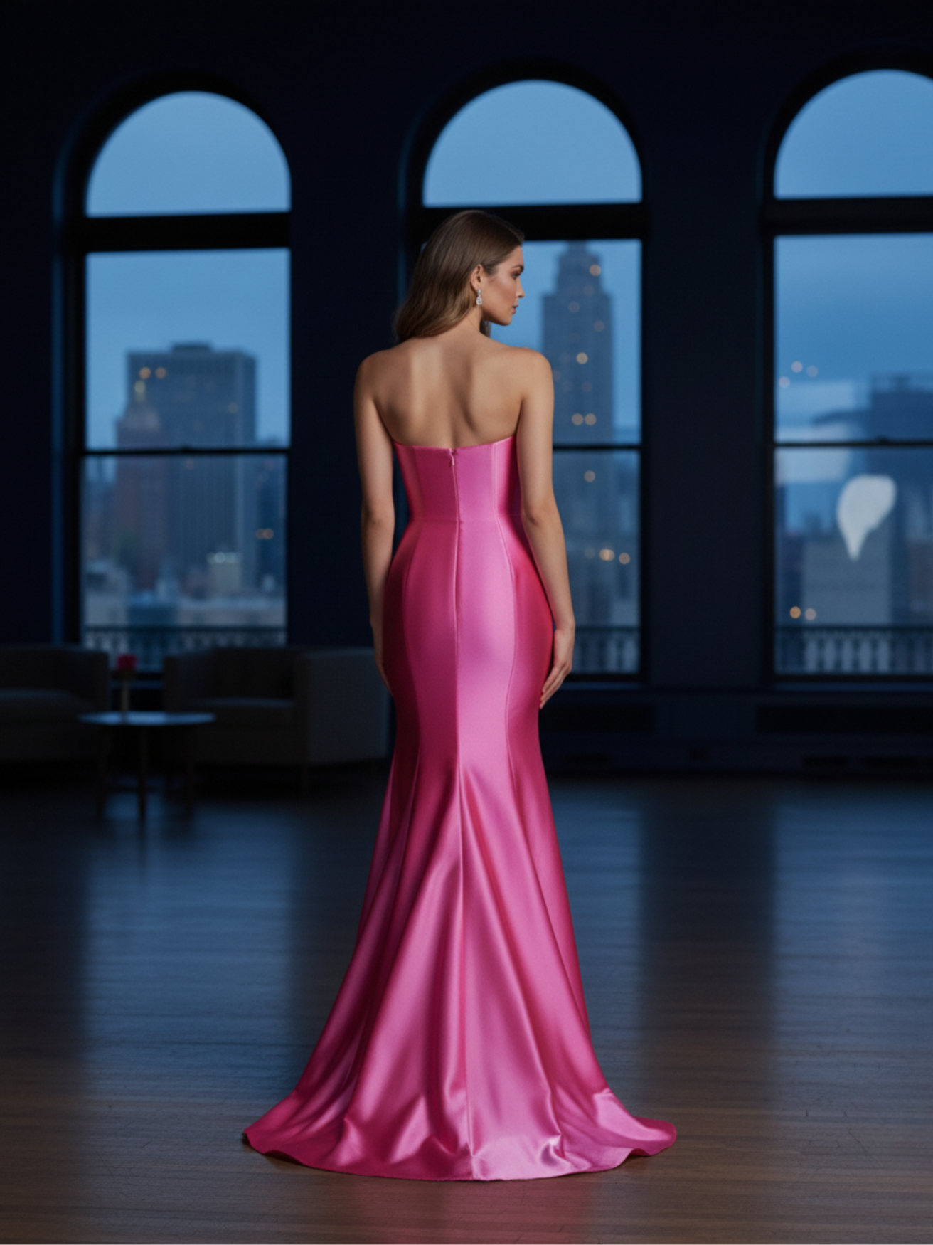Chic shiny jersey dress hugs your curves in a fit and flare silhouette with a strapless sweetheart neckline and keyhole cut out bodice featuring blingy rhinestone bows and a sultry skirt slit.