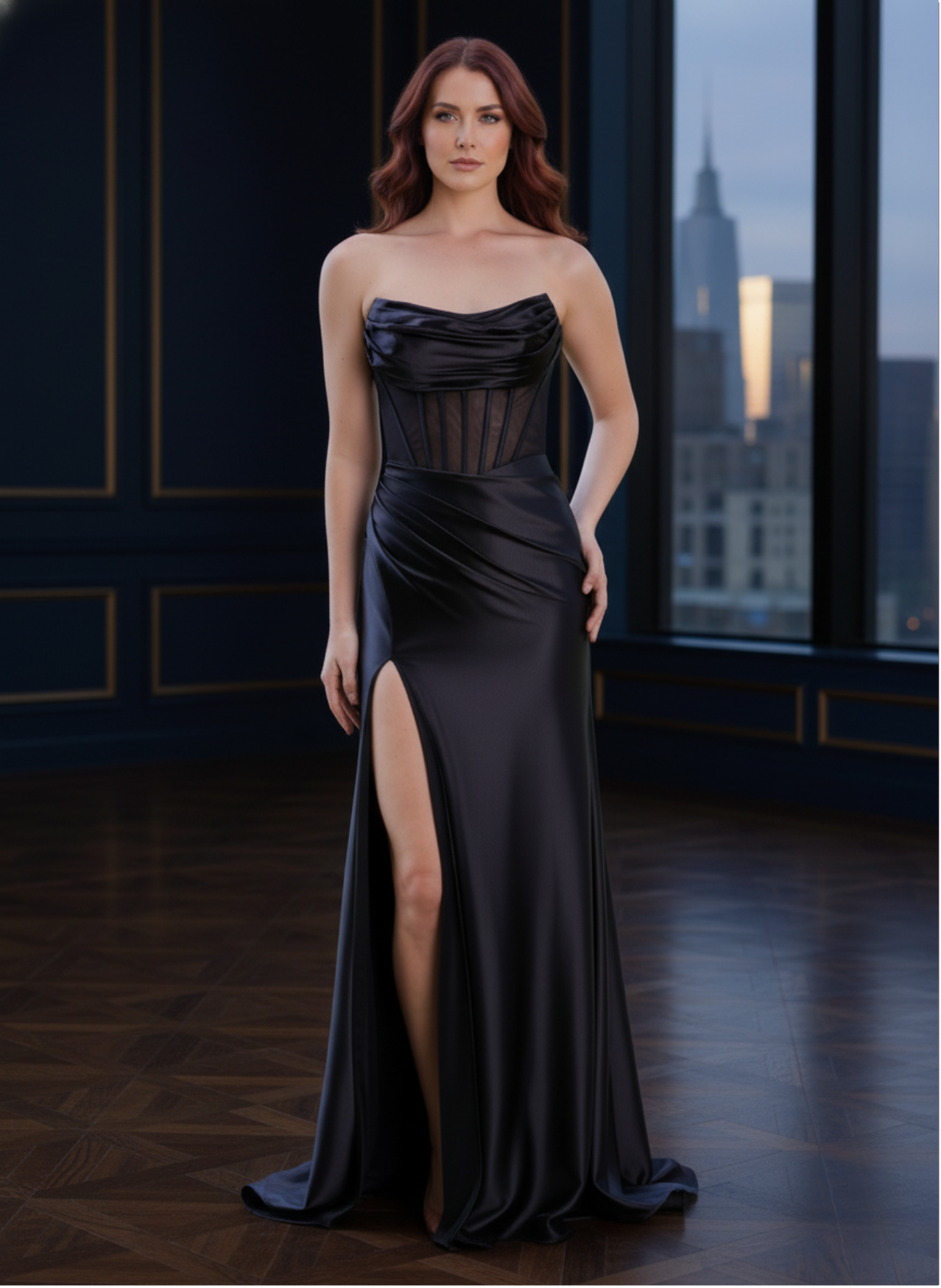 Chic fit and flare dress has a strapless neckline with a delicately draped bust detail and a sheer midriff, exposing the structured corset boning. The curve-hugging skirt features a subtle asymmetric drape and sultry slit in shiny jersey for a soft glow.