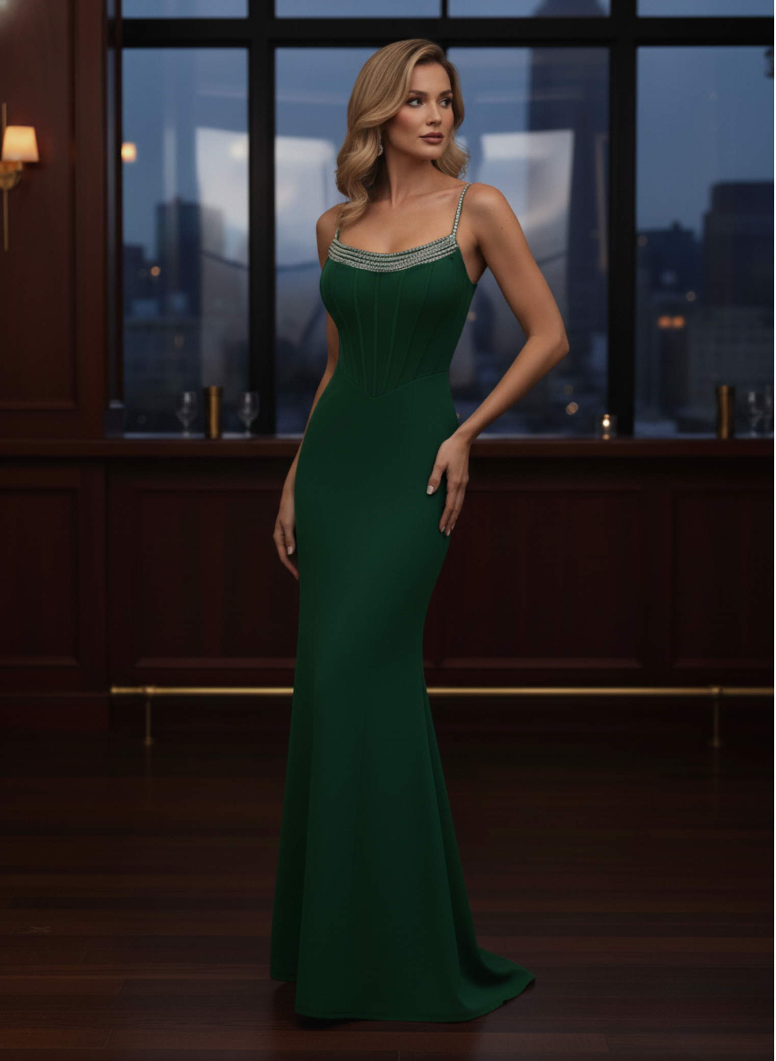 Sophisticated fit and flare dress has a scoop neckline and straps with stunning crystal beaded detailing on a corset boned bodice. The basque waist draws the eye in, while the sheer back shows off the couture boning.