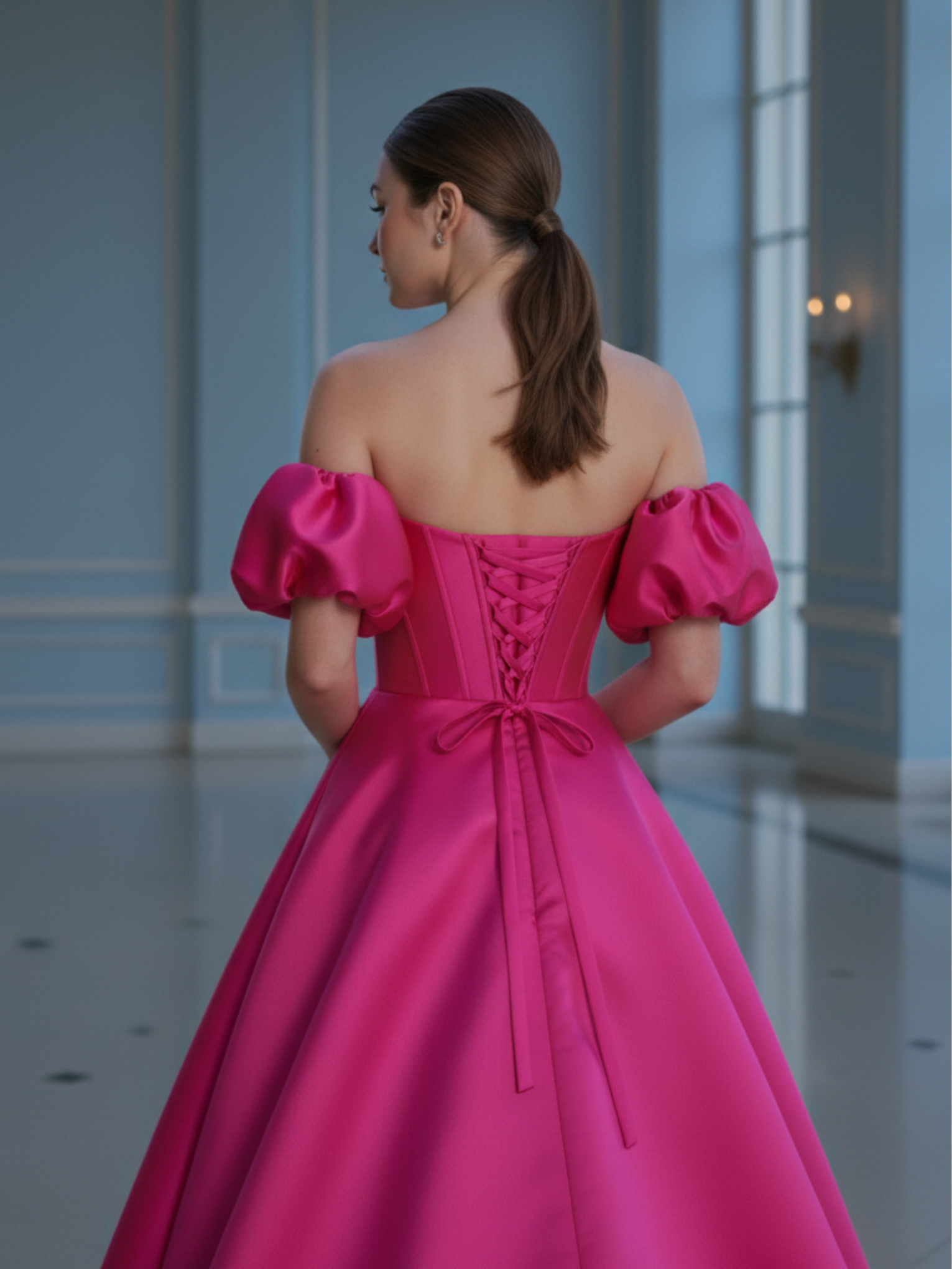 V-Notch Mikado Ball Gown with Puff Sleeves | Fuschia