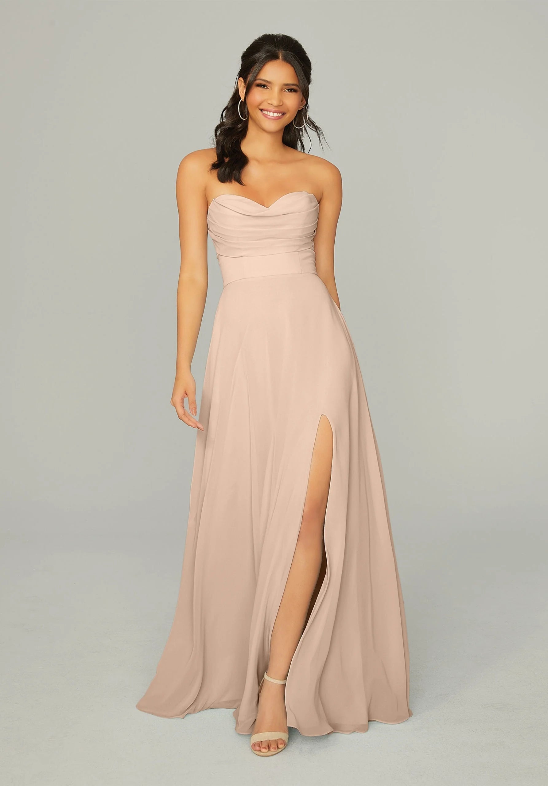 Effortless chiffon bridesmaid dress with a gorgeous draped, strapless sweetheart neckline and front skirt slit. Shown in Sea Glass and Saffron. View swatch card for available colors.